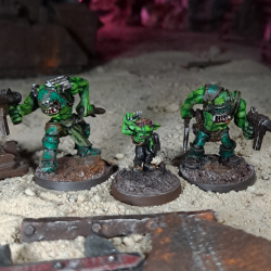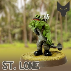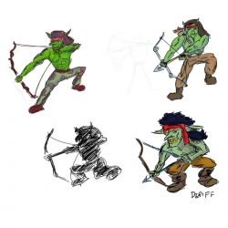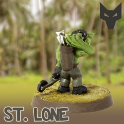 The saint stalks his prey, visiting upon them extreme violence. Even with those bulging muscles and a compound bow there's only so much he can do against the Orc oppressors; it's a tough life being a goblin. Even so he has become a legend amongst his downtrodden comrades, a lone spirit of rage. The few that have spoken to him report that he communicates almost solely through grunts, snarls, and mumbles - clearly a remnant of an old injury. What a tuff git!
